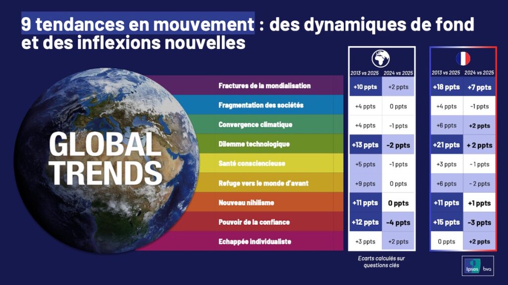 Un point essentiel tient à la manière dont les tendances sont construites. Elles ne sont pas réactualisées mécaniquement chaque année, car nous travaillons sur des dynamiques longues. Tous les deux ou trois ans, une vague plus structurante permet de revisiter la narration globale et de mettre à jour les grandes tendances. L’édition 2025 est relativement importante, compte tenu de l’intensité des transformations observées sur l’année écoulée. Le travail est également profondément collectif : une centaine d’experts Ipsos, issus de nombreux pays, contribuent à la conception, à l’analyse et à l’interprétation des résultats.