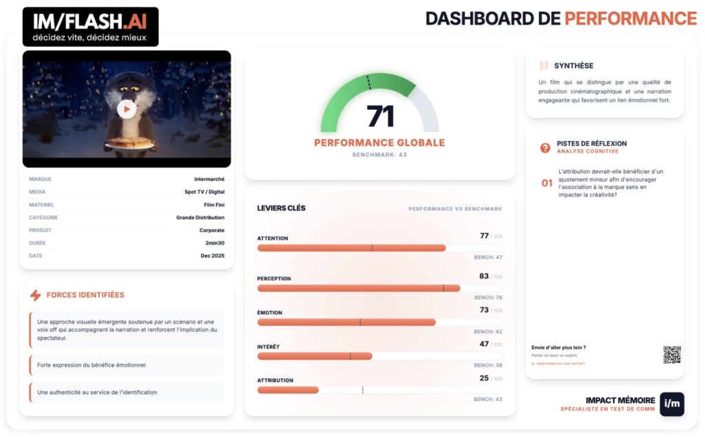 Sur une campagne Intermarché que nous avons testée, le dashboard montrait une excellente performance globale, au-dessus du benchmark. Mais l’attribution restait un point d’attention : la marque apparaissait essentiellement via le logo final. D’un point de vue cognitif, cela constituait un levier d’optimisation, même si le buzz médiatique avait largement compensé cet enjeu dans la réalité. Notre rôle est d’évaluer la performance intrinsèque de la création, indépendamment du contexte externe.