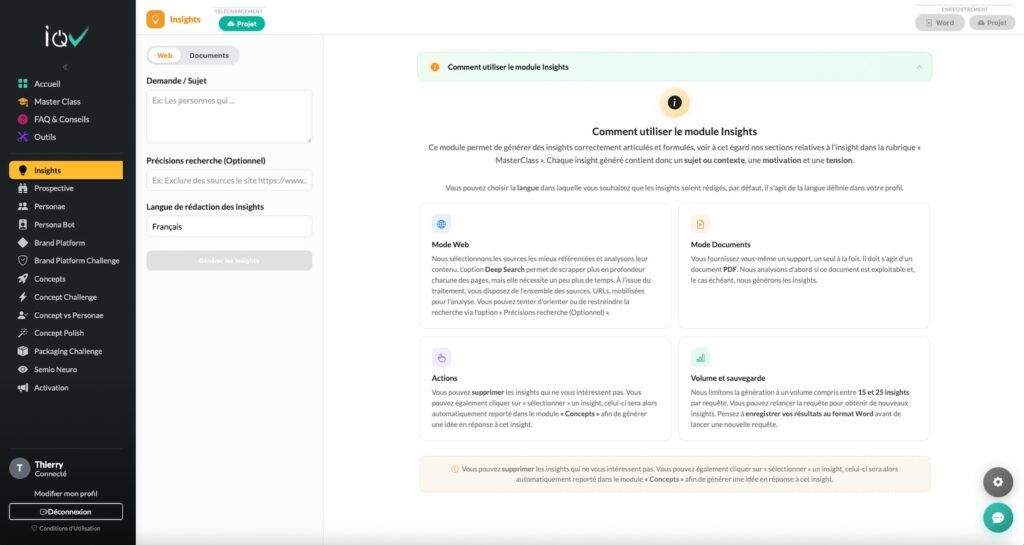 Initialement conçu comme un outil interne pour nos missions — U&A, segmentation, préparation d’un screening d’insights, tests de concepts ou de pack, design sprint — cet écosystème est devenu une plateforme ouverte au marché. Chacun sélectionne les modules qui l’intéressent et avance en mode projet avec les utilisateurs de son organisation. La plateforme donne accès aux modules, à des vidéos de Masterclass sur les bons réflexes, dans la continuité de notre expertise d’organisme de formation, à des FAQ et à un agent disponible en permanence.